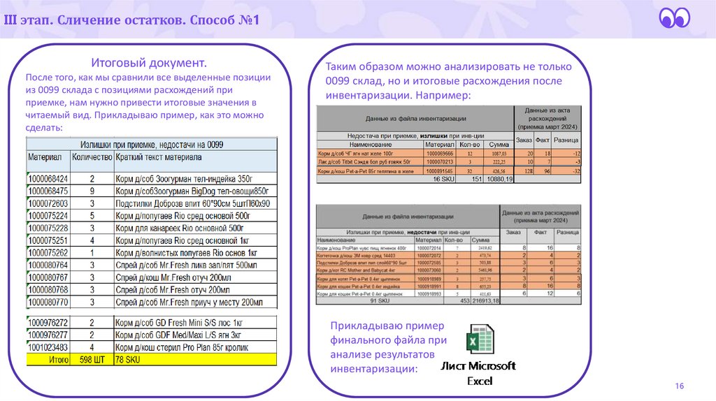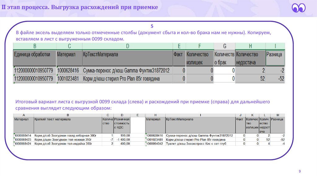 Итоговый вариант листа с выгрузкой 0099 склада (слева) и расхождений при приемке (справа) для дальнейшего