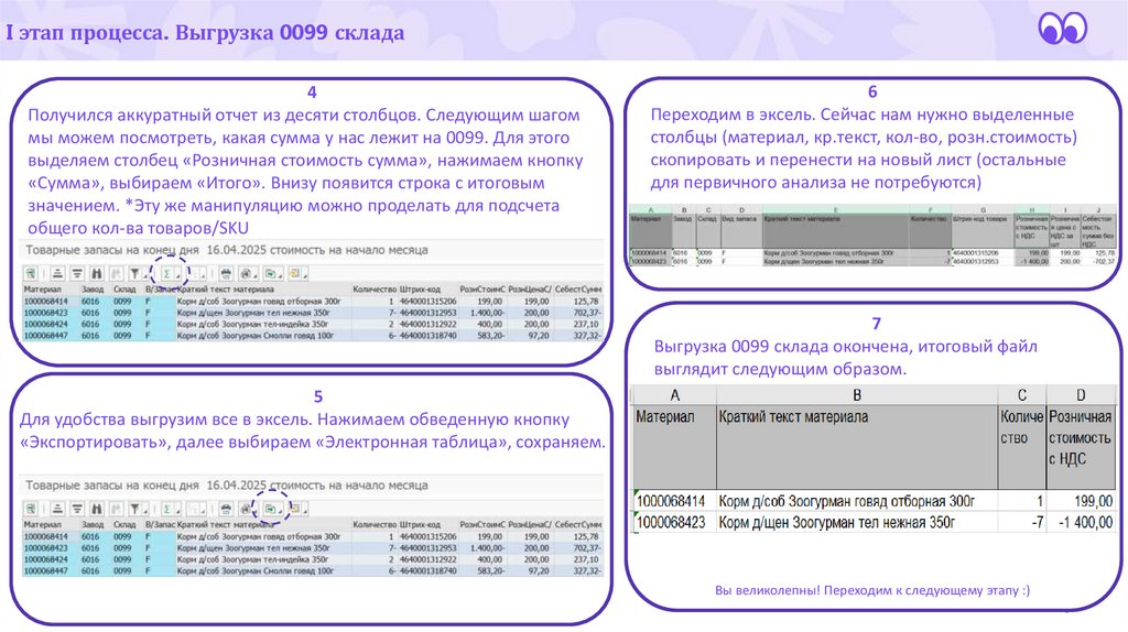 Далее нам нужно сравнить выделенные позиции из левого столбца (0099 склад) с товарами из правого столбца