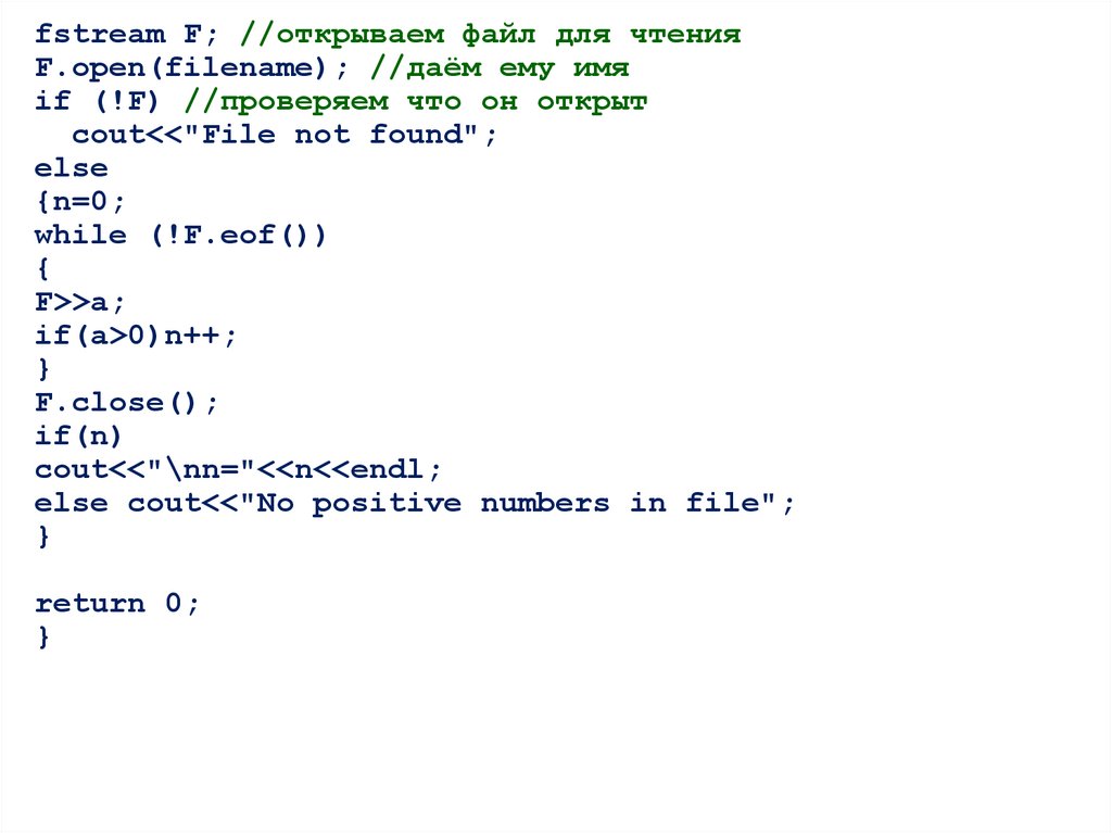 fstream F; //открываем файл для чтенияF.open(filename); //даём ему имя