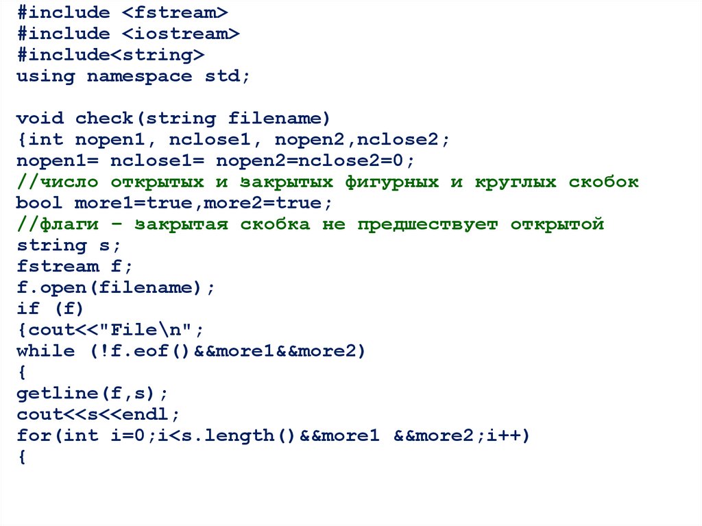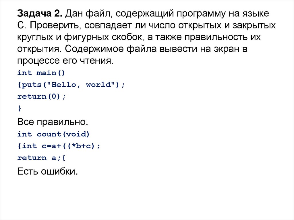Задача 2. Дан файл, содержащий программу на языкеС. Проверить, совпадает ли число открытых и закрытых