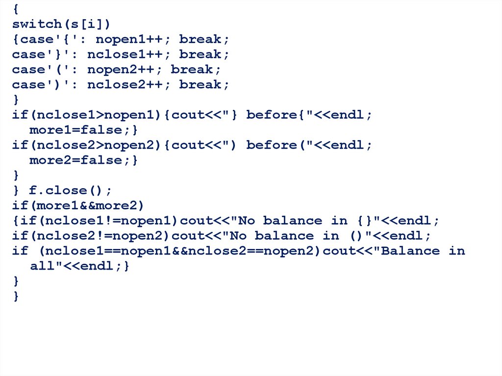 {if(nclose1!=nopen1)cout<<"No balance in {}"<<endl;