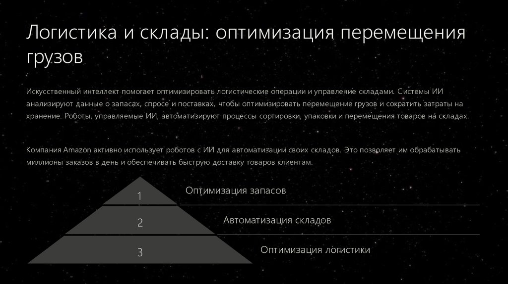 Искусственный интеллект помогает оптимизировать логистические операции и управление складами. Системы ИИ