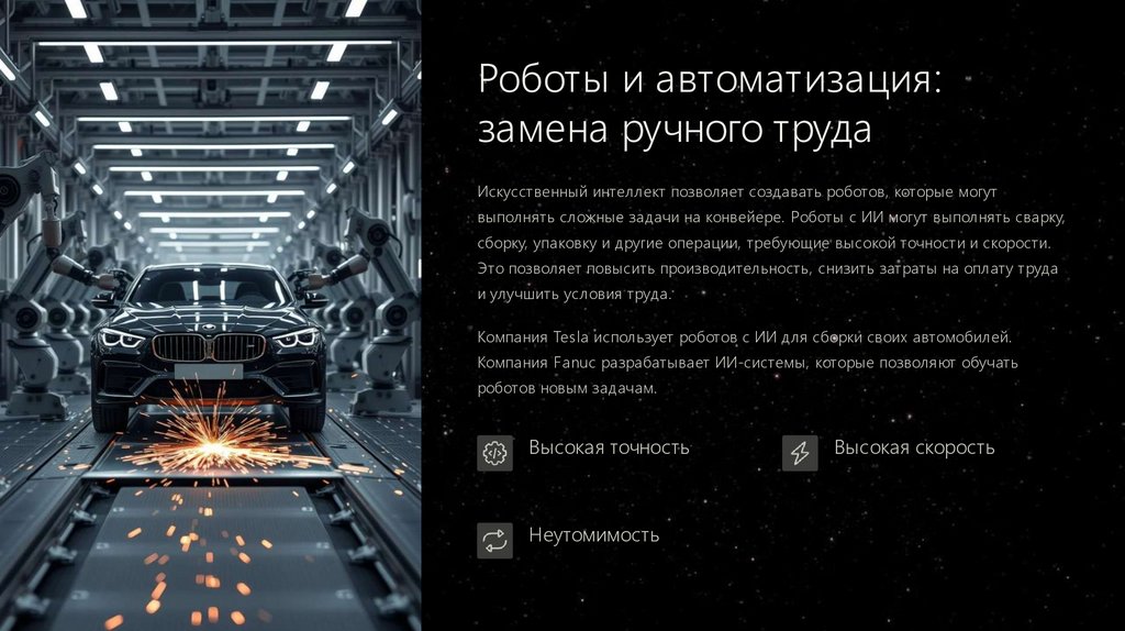 выполнять сложные задачи на конвейере. Роботы с ИИ могут выполнять сварку,
