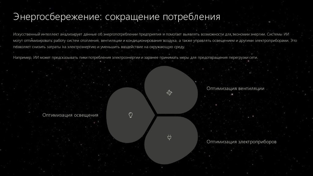 Например, ИИ может предсказывать пики потребления электроэнергии и заранее принимать меры для предотвращения перегрузки сети.