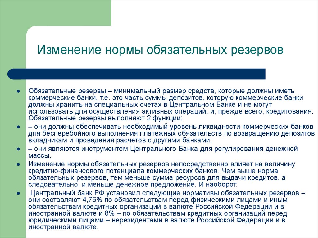 Изменение нормы обязательных резервовОбязательные резервы – минимальный размер средств, которые должны иметь