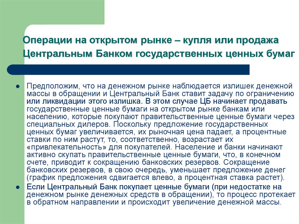 Операции на открытом рынке – купля или продажаЦентральным Банком государственных ценных бумаг