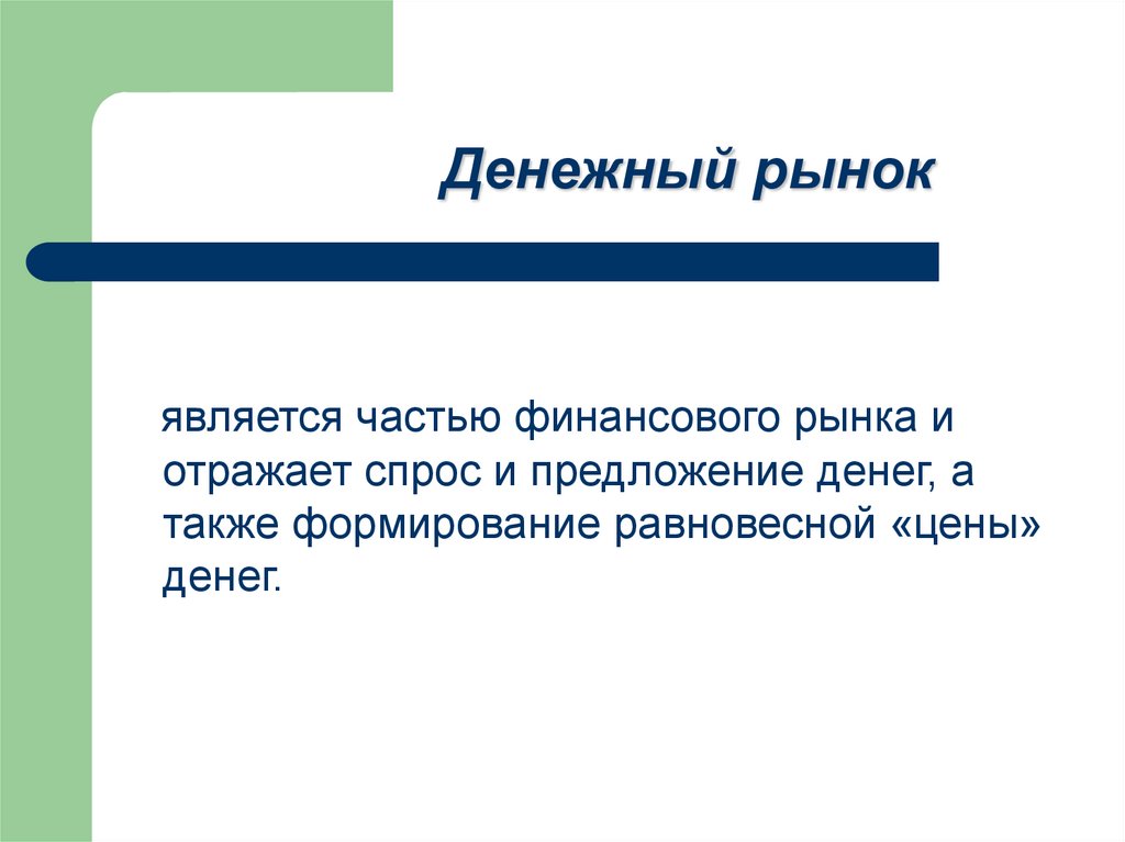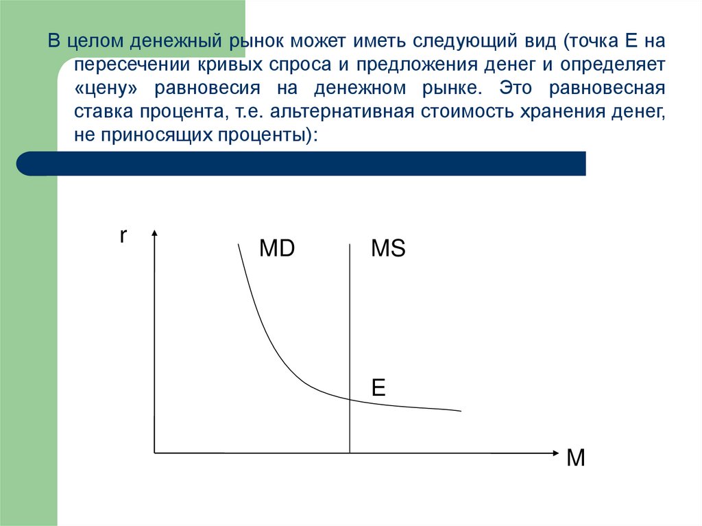 В целом денежный рынок может иметь следующий вид (точка Е напересечении кривых спроса и предложения денег и определяет