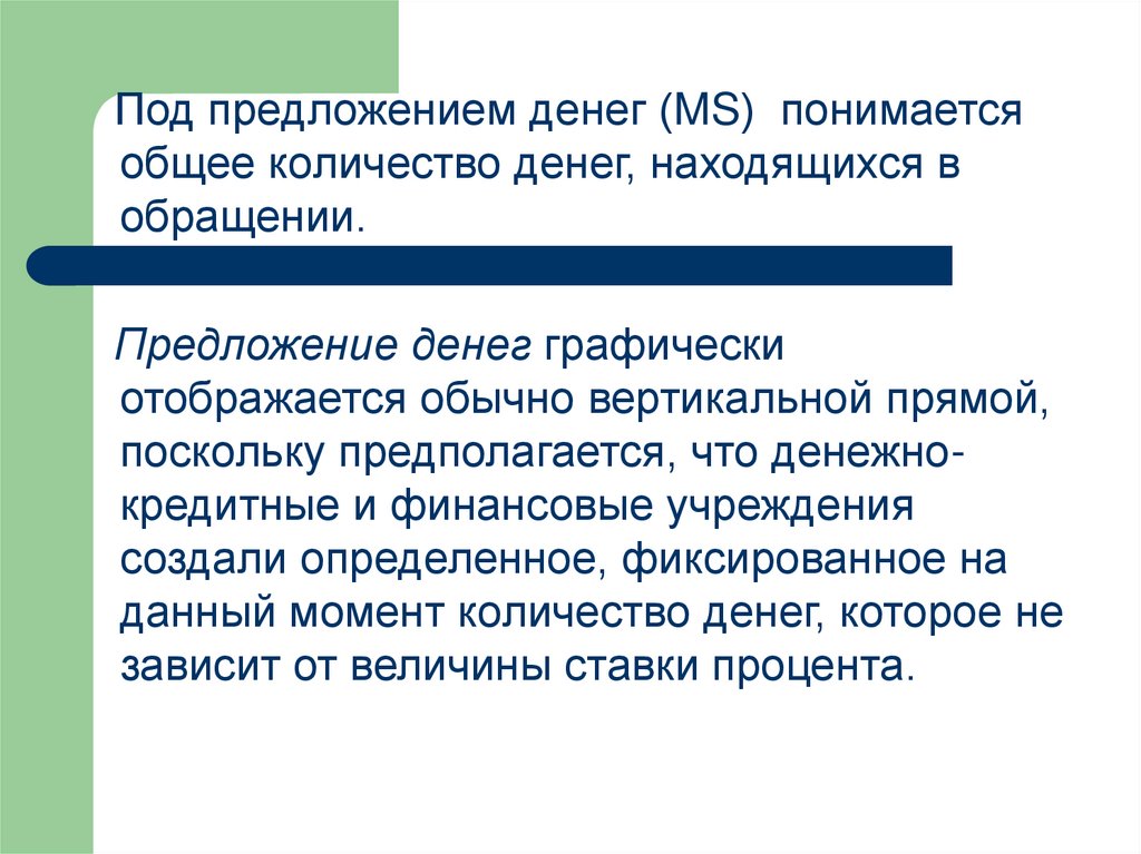 Под предложением денег (MS) понимаетсяобщее количество денег, находящихся в