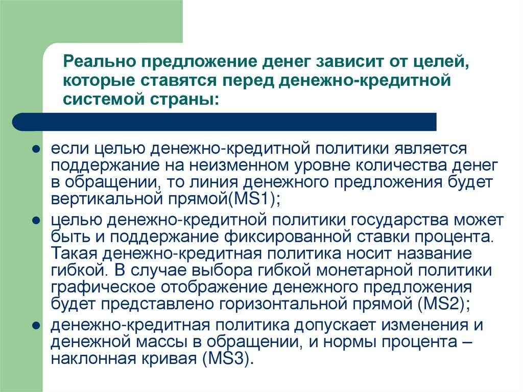 Реально предложение денег зависит от целей,которые ставятся перед денежно-кредитной