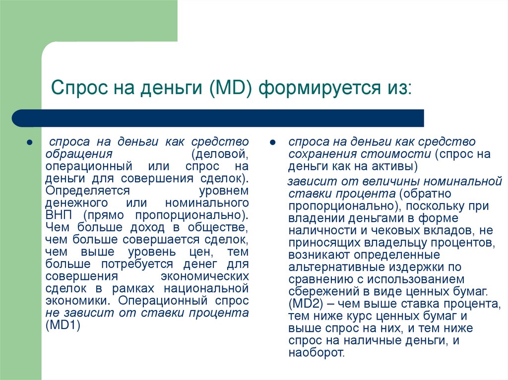 Спрос на деньги (MD) формируется из:спроса на деньги как средство