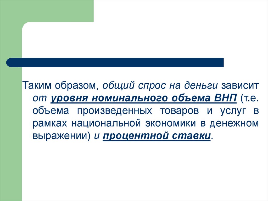Таким образом, общий спрос на деньги зависитот уровня номинального объема ВНП (т.е.