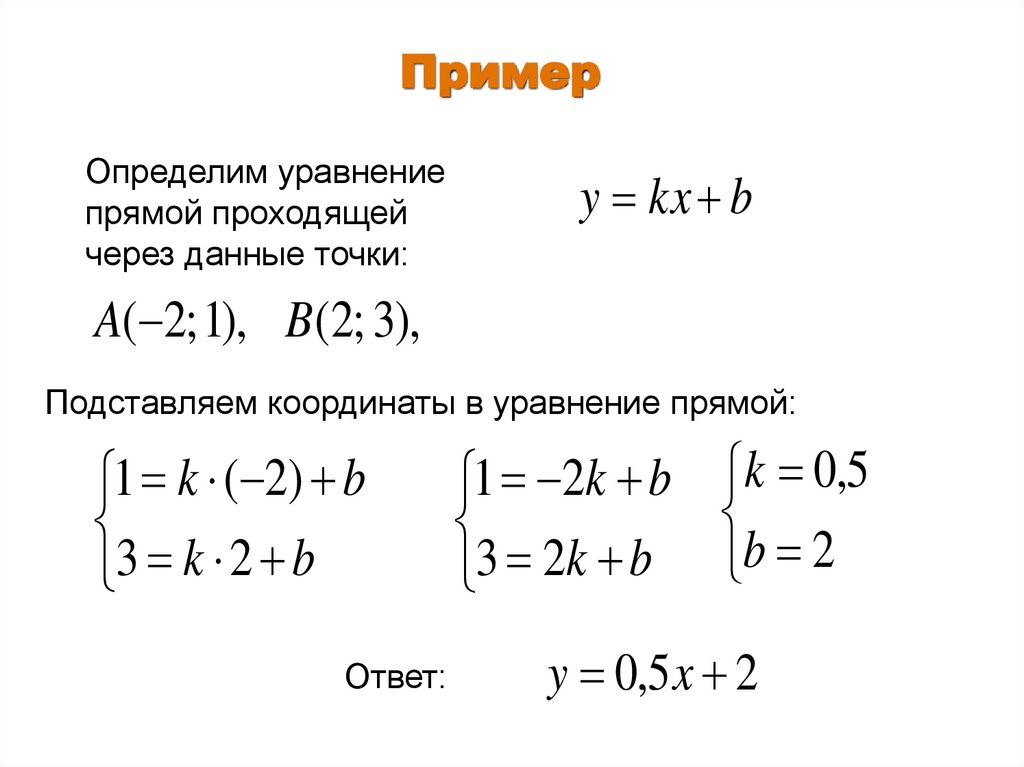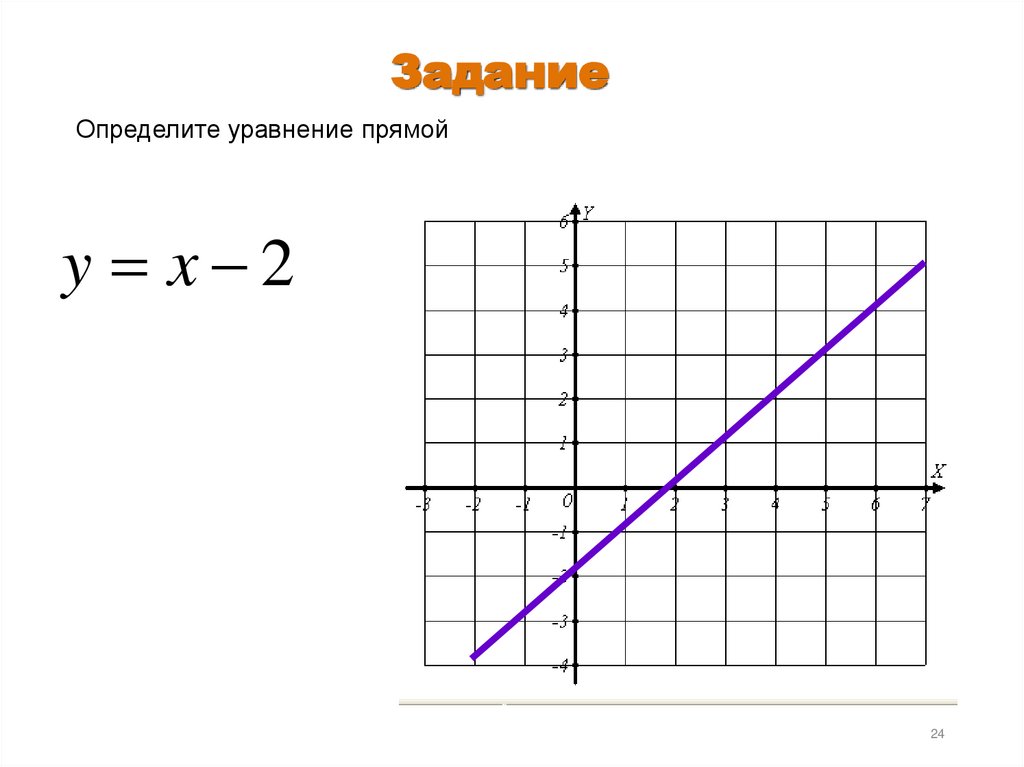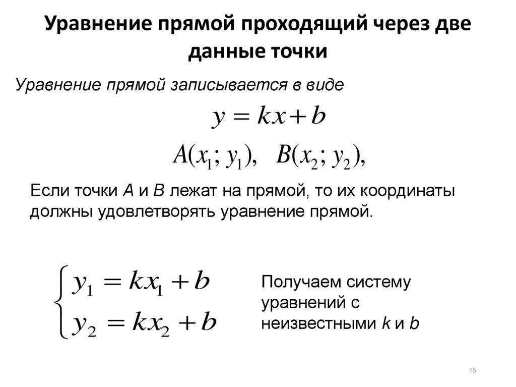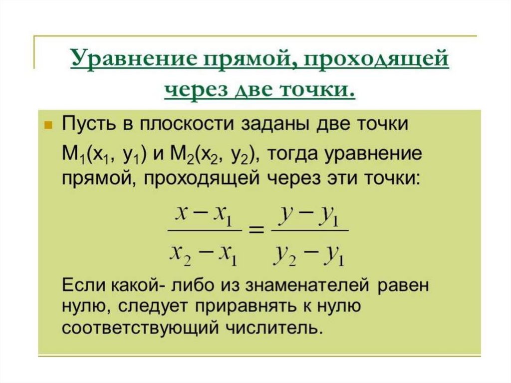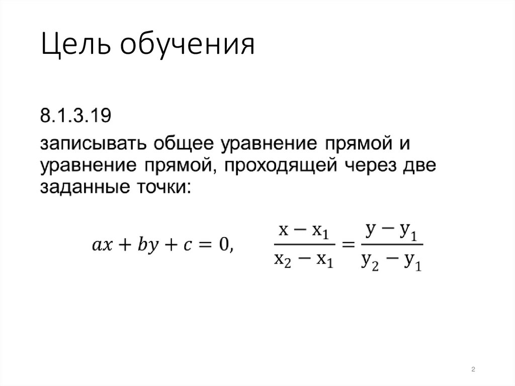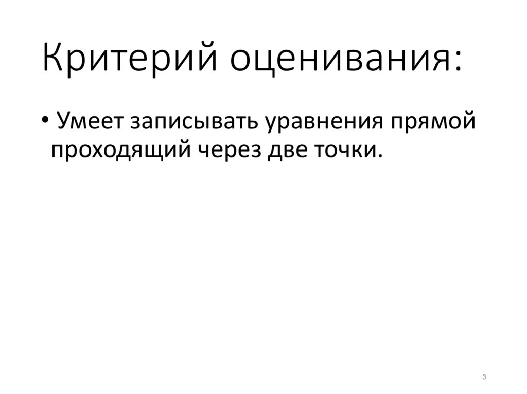 • Умеет записывать уравнения прямойпроходящий через две точки.