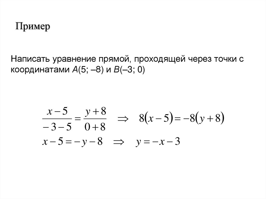 Написать уравнение прямой, проходящей через точки скоординатами А(5; –8) и В(–3; 0)