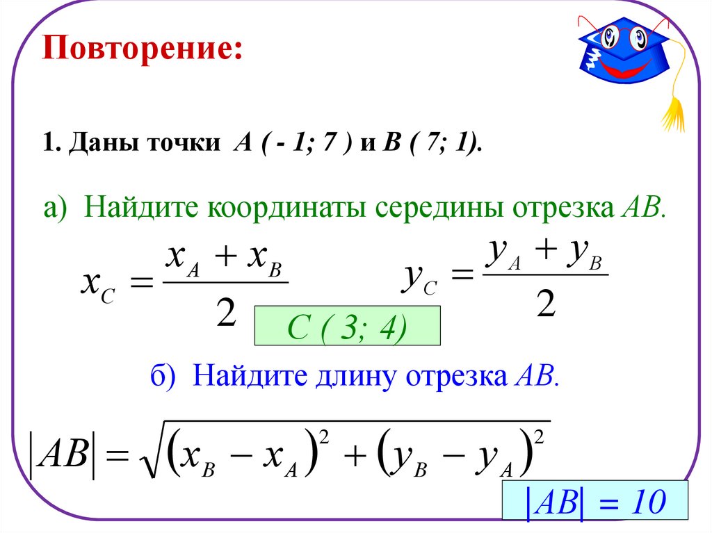 1. Даны точки А ( - 1; 7 ) и В ( 7; 1).а) Найдите координаты середины отрезка АВ.