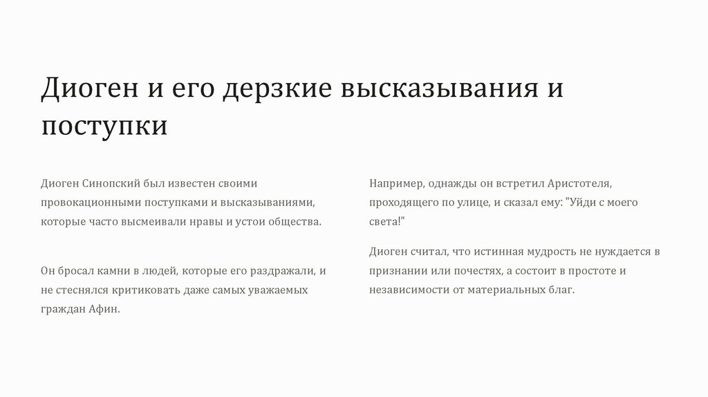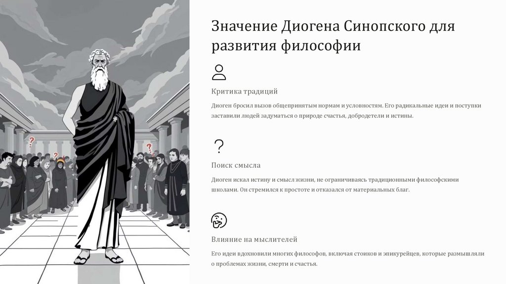 Диоген бросил вызов общепринятым нормам и условностям. Его радикальные идеи и поступки