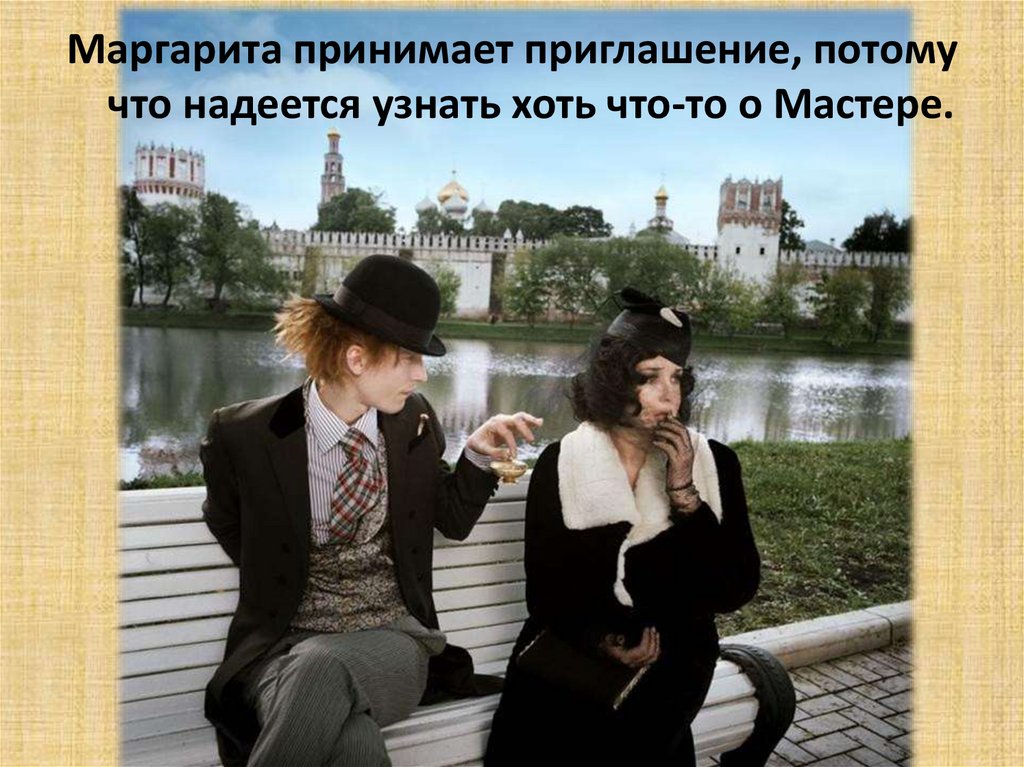 Маргарита принимает приглашение, потомучто надеется узнать хоть что-то о Мастере.
