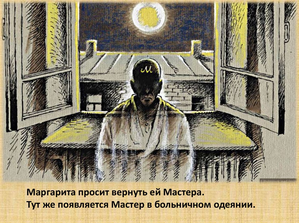 Маргарита просит вернуть ей Мастера.Тут же появляется Мастер в больничном одеянии.