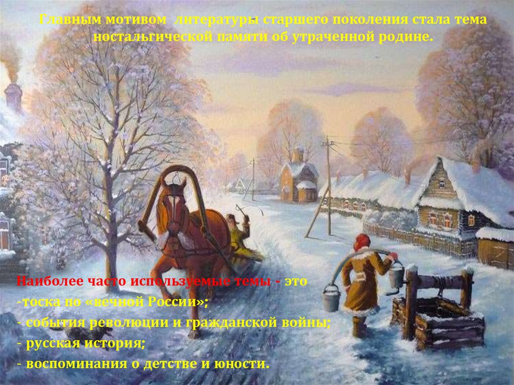 Наиболее часто используемые темы - это-тоска по «вечной России»;