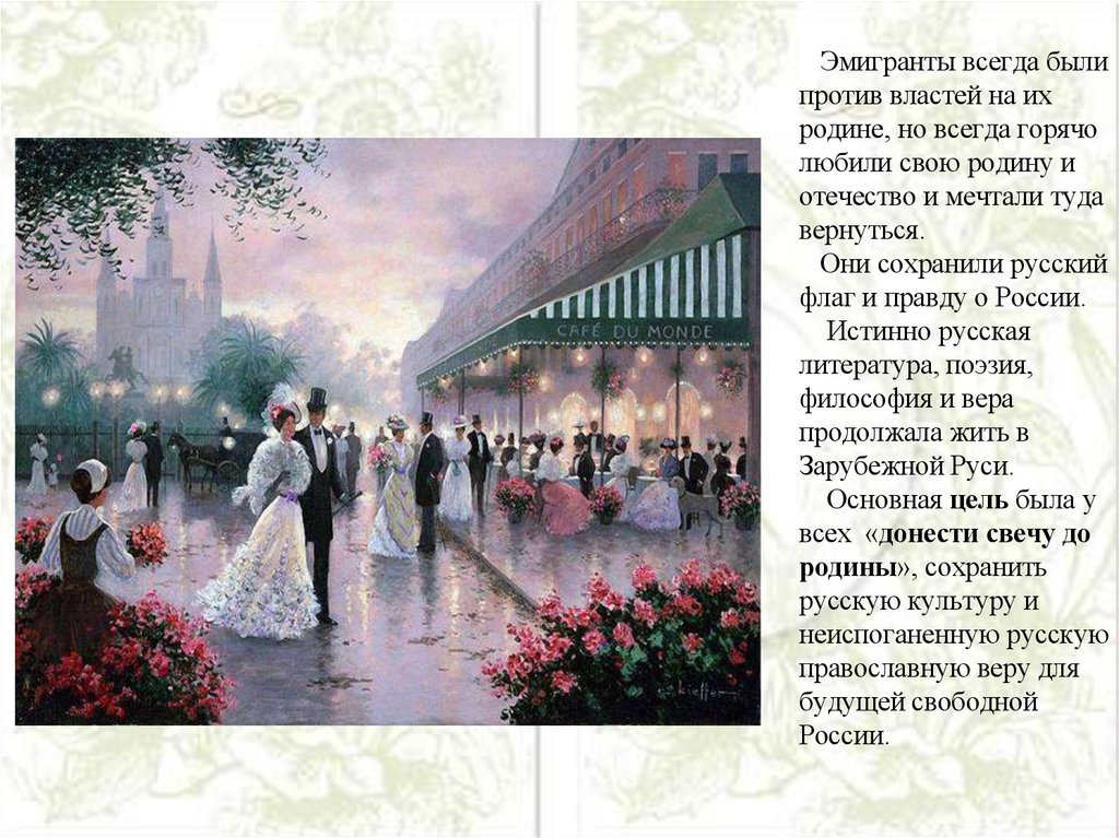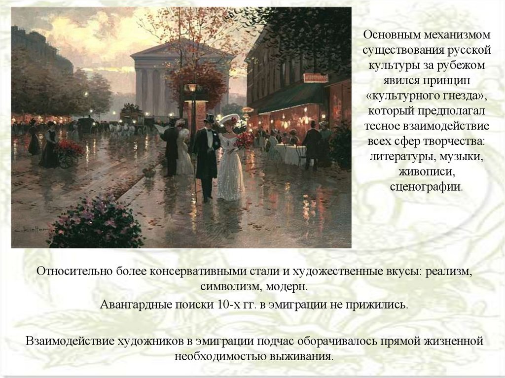51. Основным механизмом существования русской культуры за рубежом явился принцип «культурного гнезда», который предполагал тесное