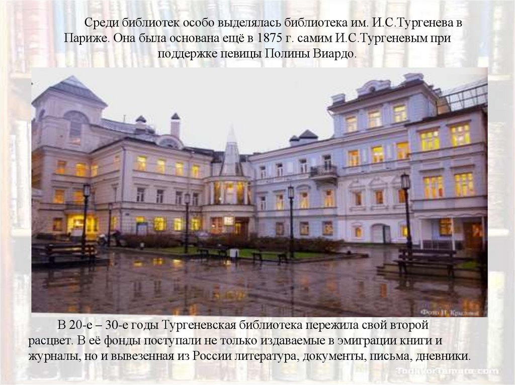 43. Среди библиотек особо выделялась библиотека им. И.С.Тургенева в Париже. Она была основана ещё в 1875 г. самим И.С.Тургеневым