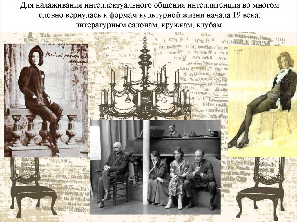 46. Для налаживания интеллектуального общения интеллигенция во многом словно вернулась к формам культурной жизни начала 19 века: