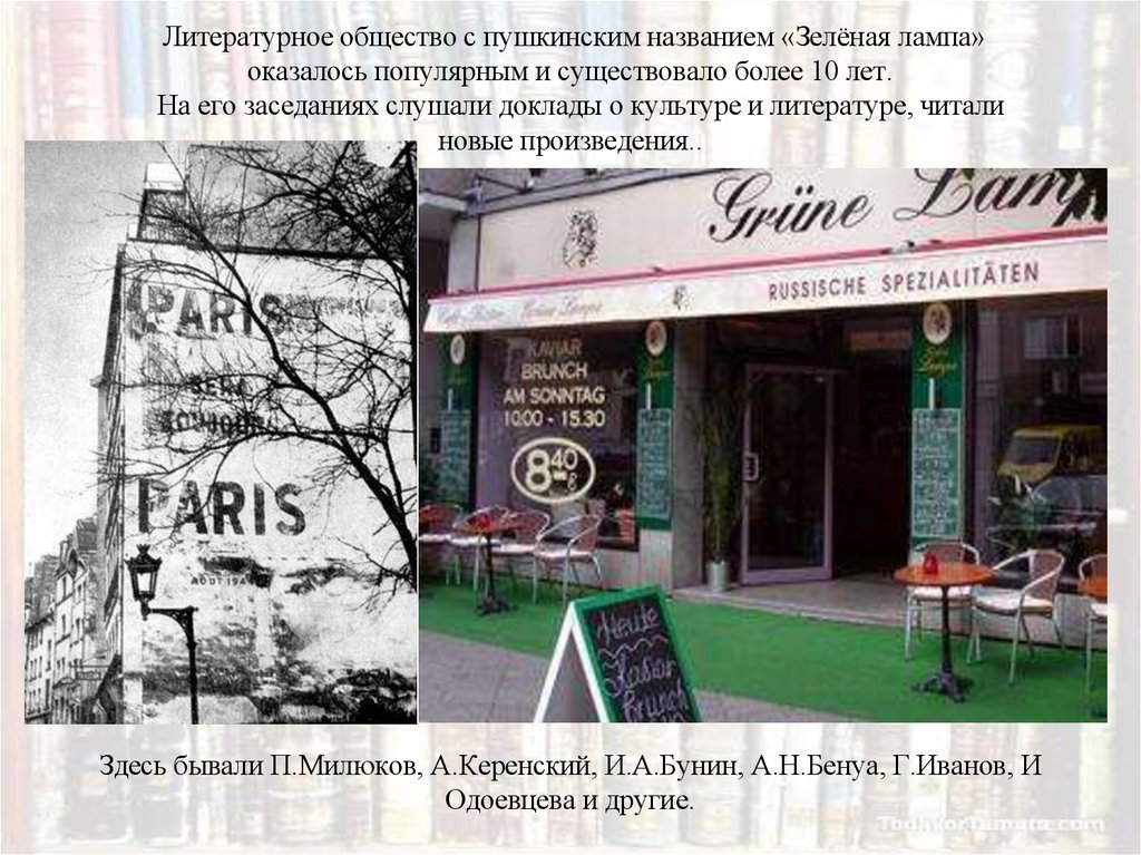 Здесь бывали П.Милюков, А.Керенский, И.А.Бунин, А.Н.Бенуа, Г.Иванов, И