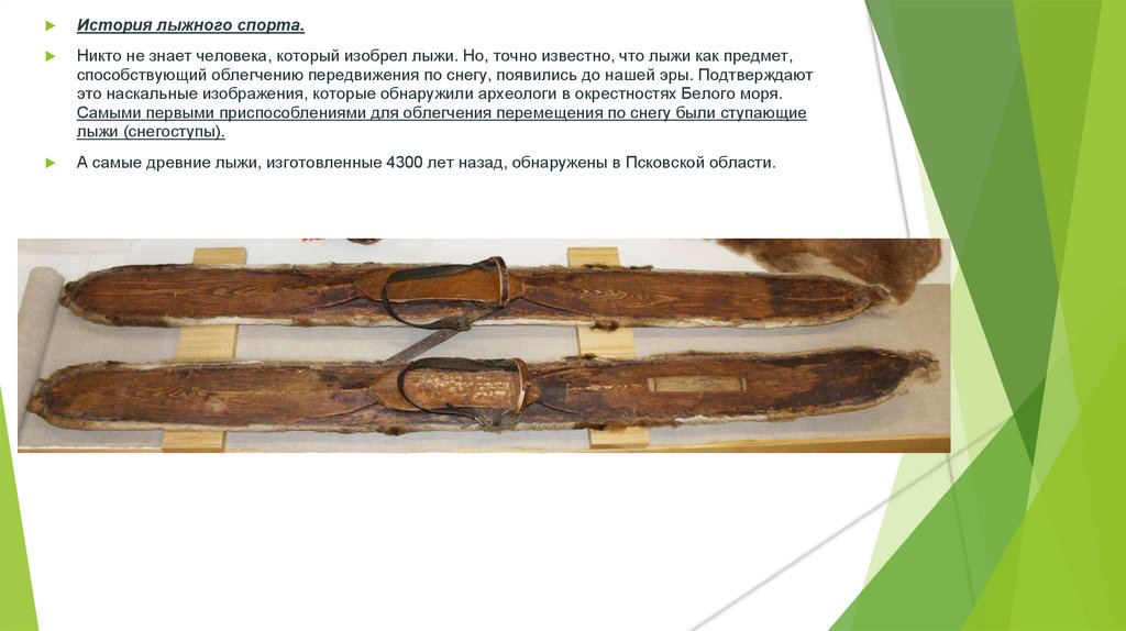 А самые древние лыжи, изготовленные 4300 лет назад, обнаружены в Псковской области.