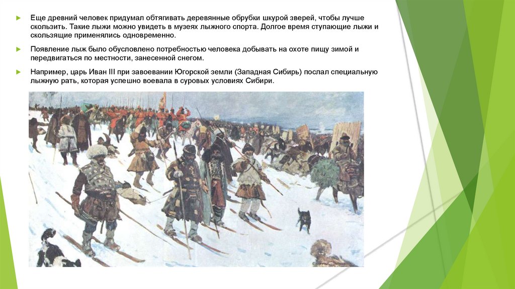 Появление лыж было обусловлено потребностью человека добывать на охоте пищу зимой и