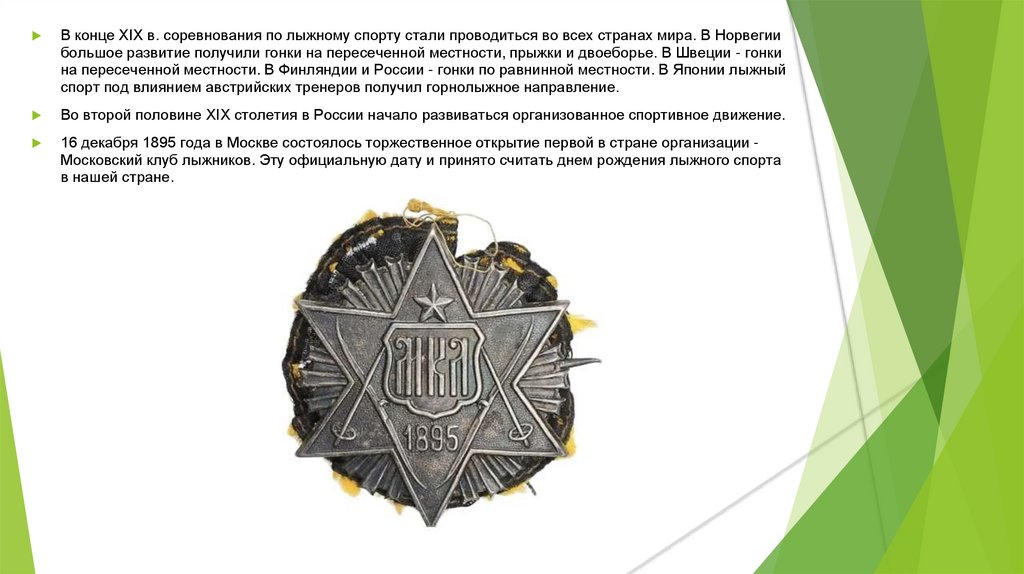 16 декабря 1895 года в Москве состоялось торжественное открытие первой в стране организации Московский клуб лыжников. Эту официальную дату и принято считать днем рождения лыжного спорта