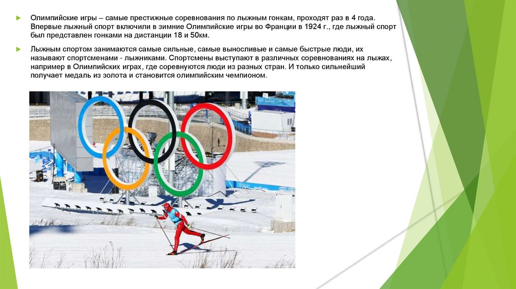 Олимпийские игры – самые престижные соревнования по лыжным гонкам, проходят раз в 4 года.Впервые лыжный спорт включили в зимние Олимпийские игры во Франции в 1924 г., где лыжный спорт
