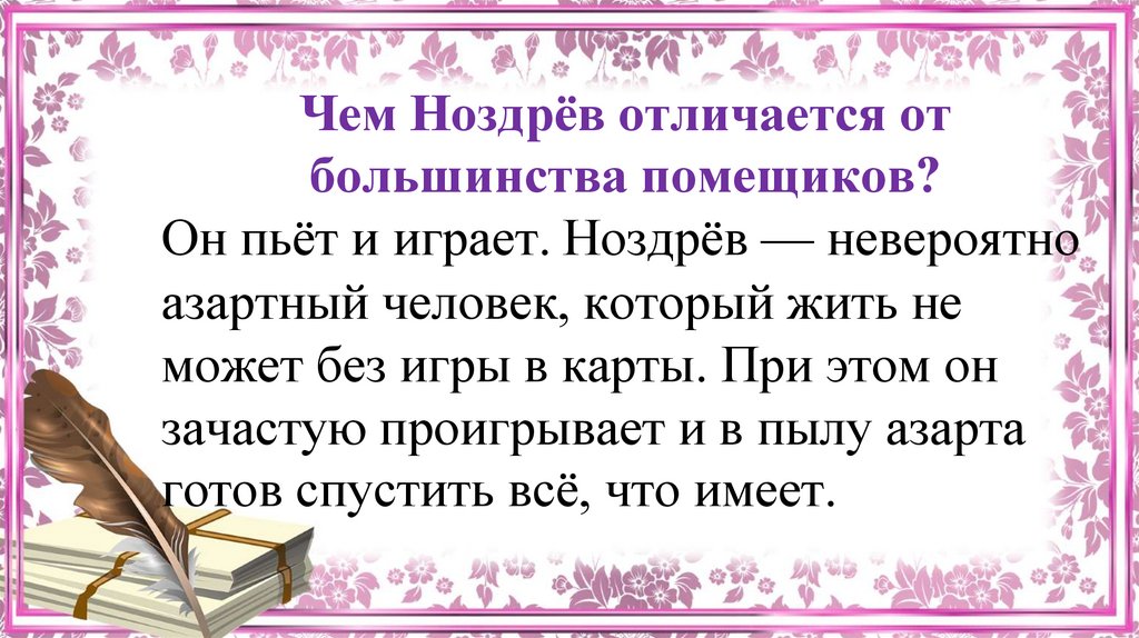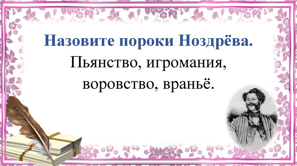Назовите пороки Ноздрёва.Пьянство, игромания,