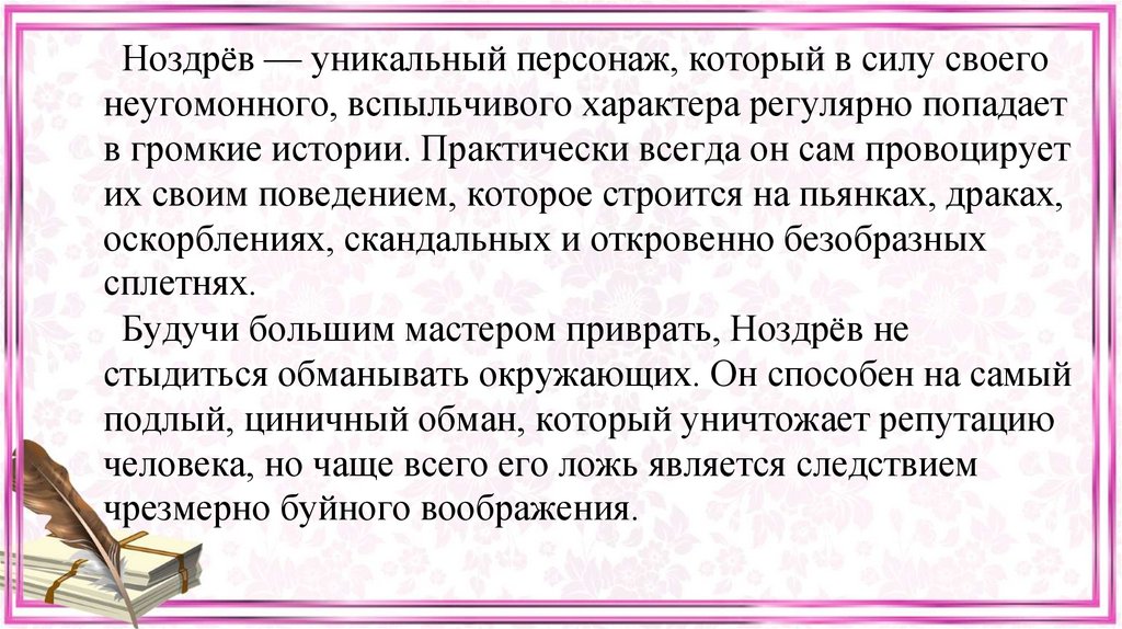 Ноздрёв — уникальный персонаж, который в силу своегонеугомонного, вспыльчивого характера регулярно попадает