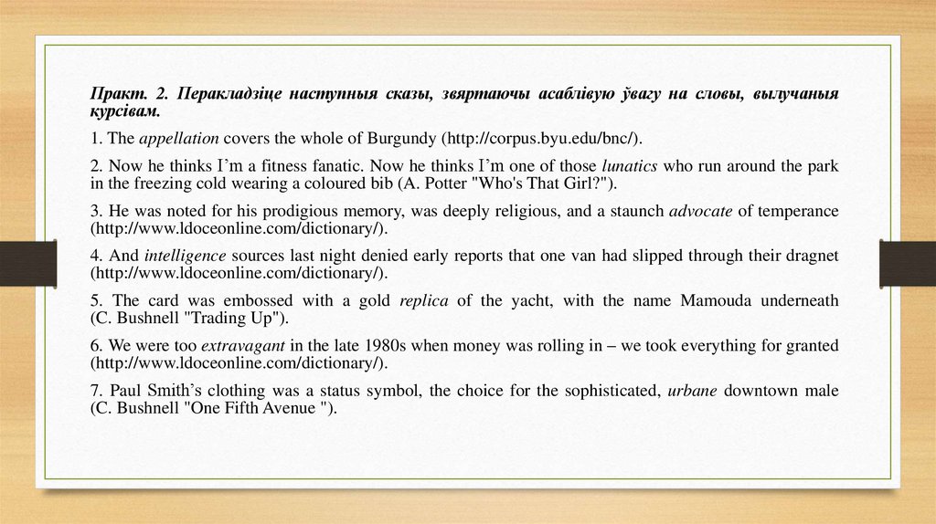 Практ. 2. Перакладзіце наступныя сказы, звяртаючы асаблівую ўвагу на словы, вылучаныякурсівам.