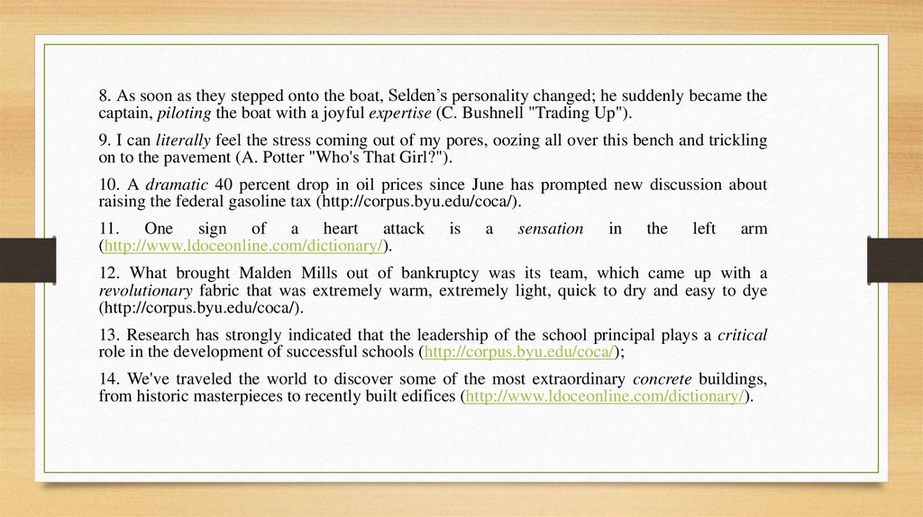 8. As soon as they stepped onto the boat, Selden’s personality changed; he suddenly became thecaptain, piloting the boat with a joyful expertise (C. Bushnell "Trading Up").