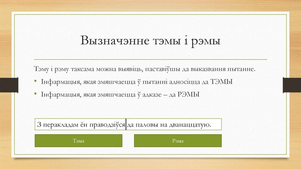 Тэму і рэму таксама можна выявіць, паставіўшы да выказвання пытанне.• Інфармацыя, якая змяшчаецца ў пытанні адносіцца да ТЭМЫ