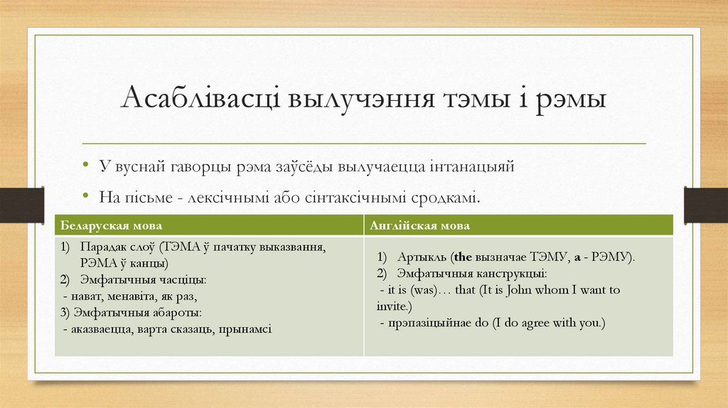 • У вуснай гаворцы рэма заўсёды вылучаецца інтанацыяй• На пісьме - лексічнымі або сінтаксічнымі сродкамі.