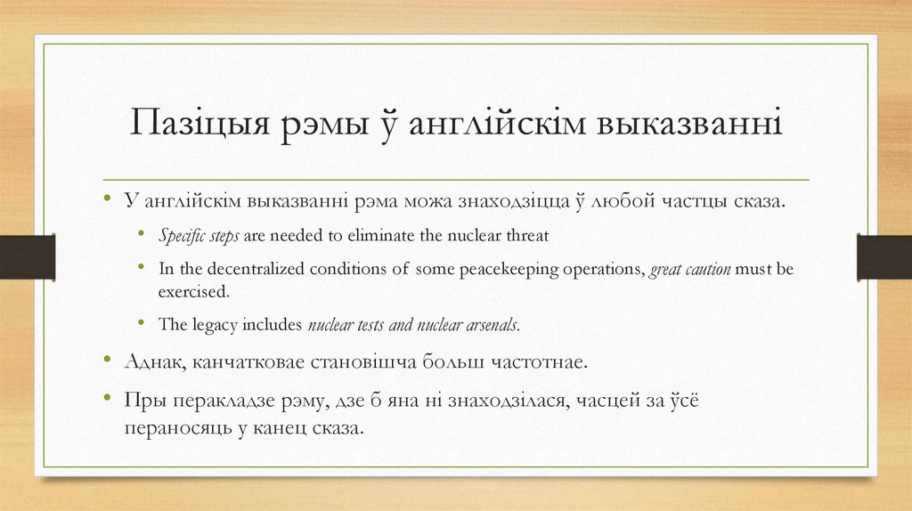 • У англійскім выказванні рэма можа знаходзіцца ў любой частцы сказа.• Specific steps are needed to eliminate the nuclear threat