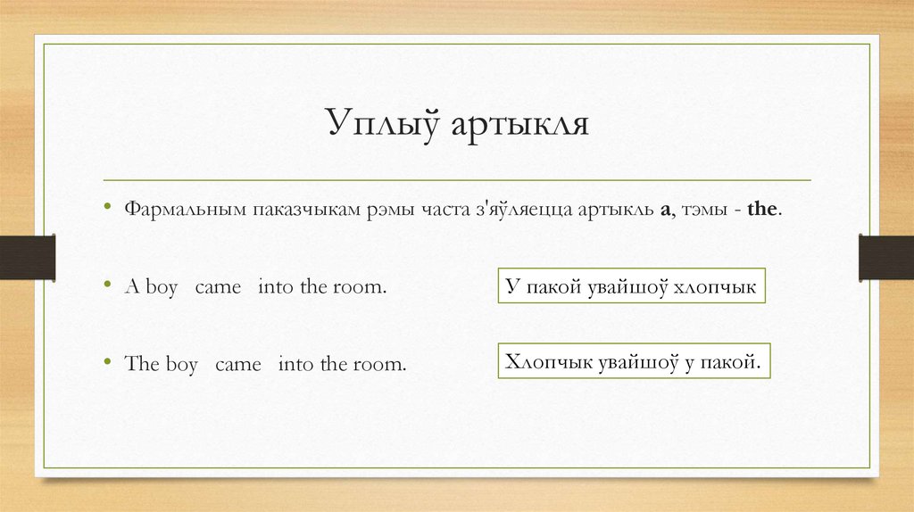 • Фармальным паказчыкам рэмы часта з'яўляецца артыкль a, тэмы - the.• A boy came into the room.