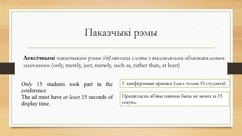 Лексічнымі паказчыкамі рэмы з'яўляюцца словы з выдзяляльна-абмежавальнымзначэннем (only, merely, just, namely, such as, rather than, at least)