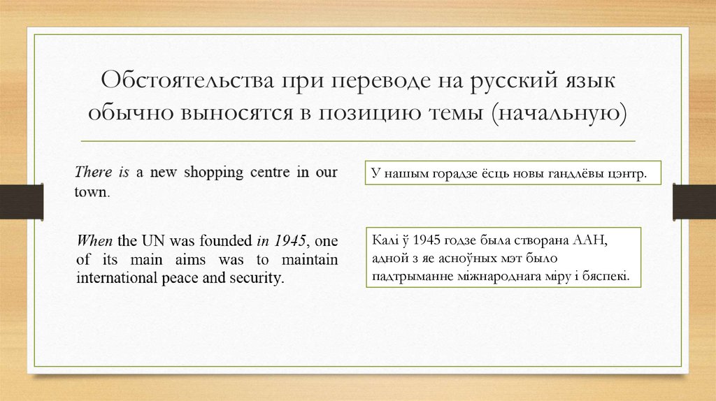 21. Обстоятельства при переводе на русский язык обычно выносятся в позицию темы (начальную)