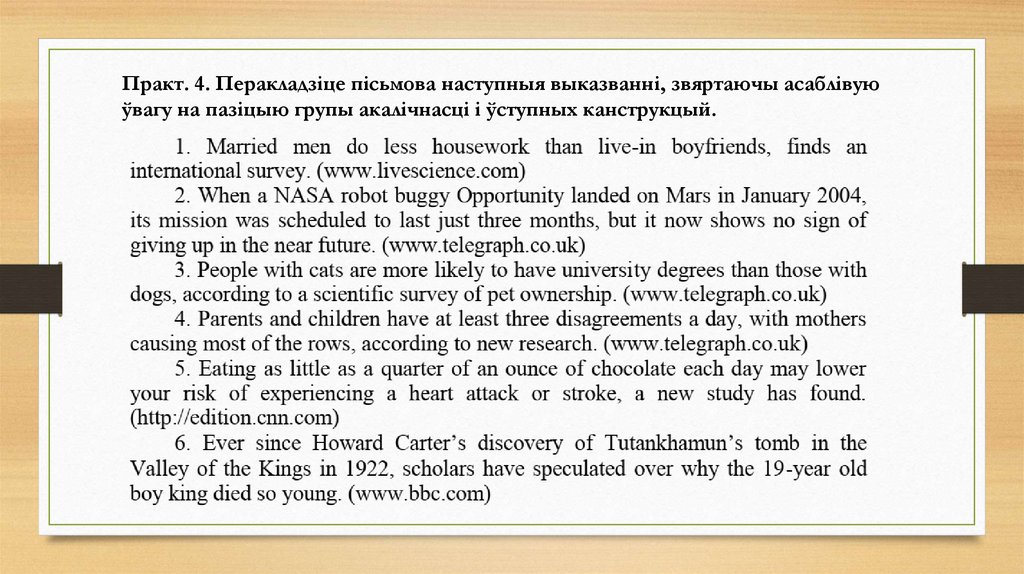 Практ. 4. Перакладзіце пісьмова наступныя выказванні, звяртаючы асаблівуюўвагу на пазіцыю групы акалічнасці і ўступных канструкцый.