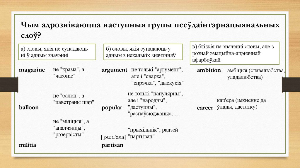 Чым адрозніваюцца наступныя групы псеўдаінтэрнацыянальныхслоў?