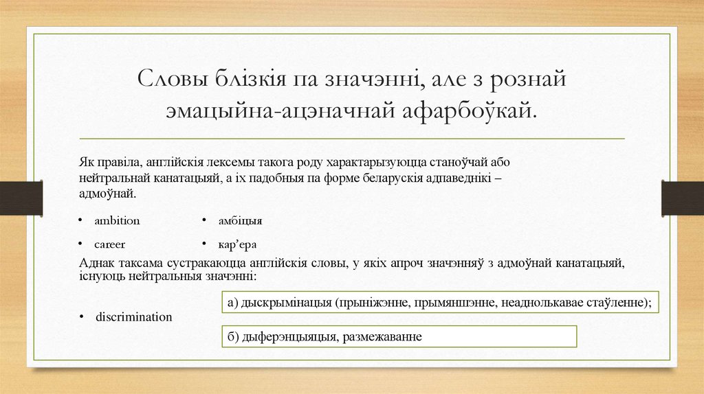 Як правіла, англійскія лексемы такога роду характарызуюцца станоўчай абонейтральнай канатацыяй, а іх падобныя па форме беларускія адпаведнікі –