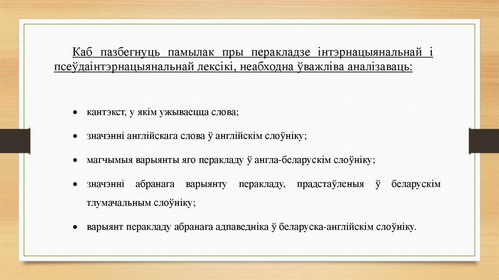 Каб пазбегнуць памылак пры перакладзе інтэрнацыянальнай іпсеўдаінтэрнацыянальнай лексікі, неабходна ўважліва аналізаваць: