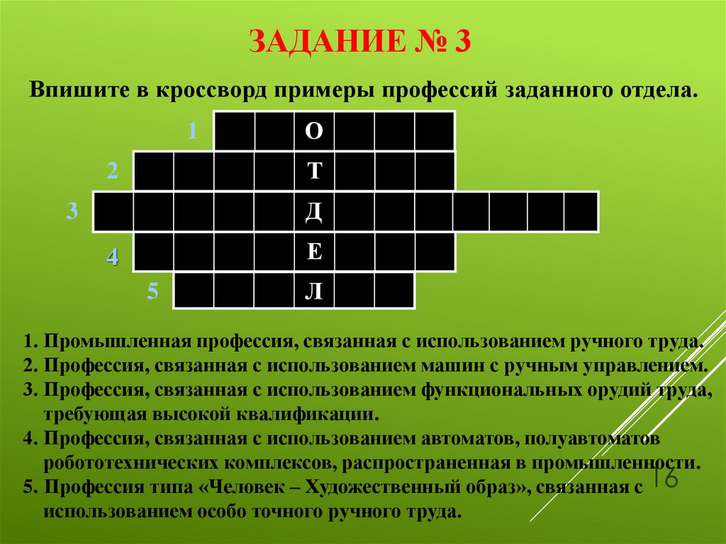 ЗАДАНИЕ № 3Впишите в кроссворд примеры профессий заданного отдела.