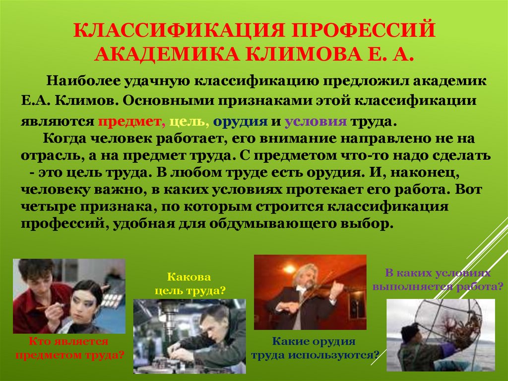 Е.А. Климов. Основными признаками этой классификации