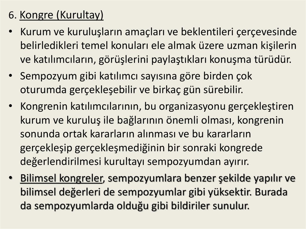 • Bilimsel kongreler, sempozyumlara benzer şekilde yapılır ve