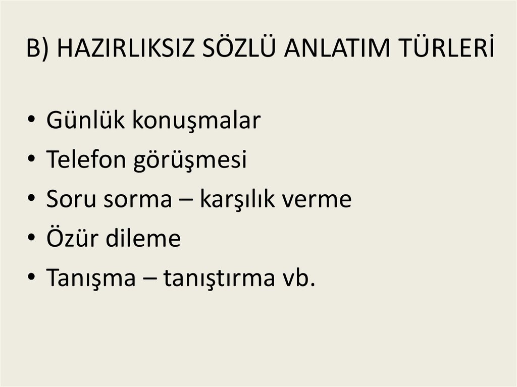 B) HAZIRLIKSIZ SÖZLÜ ANLATIM TÜRLERİ