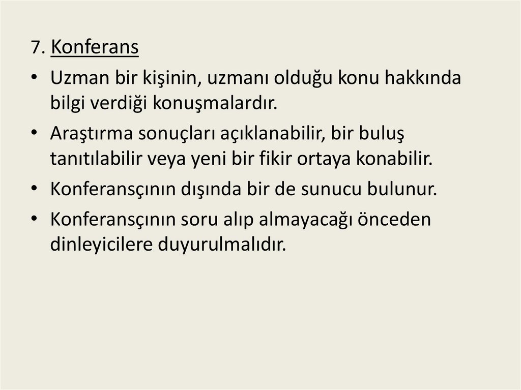 7. Konferans• Uzman bir kişinin, uzmanı olduğu konu hakkında