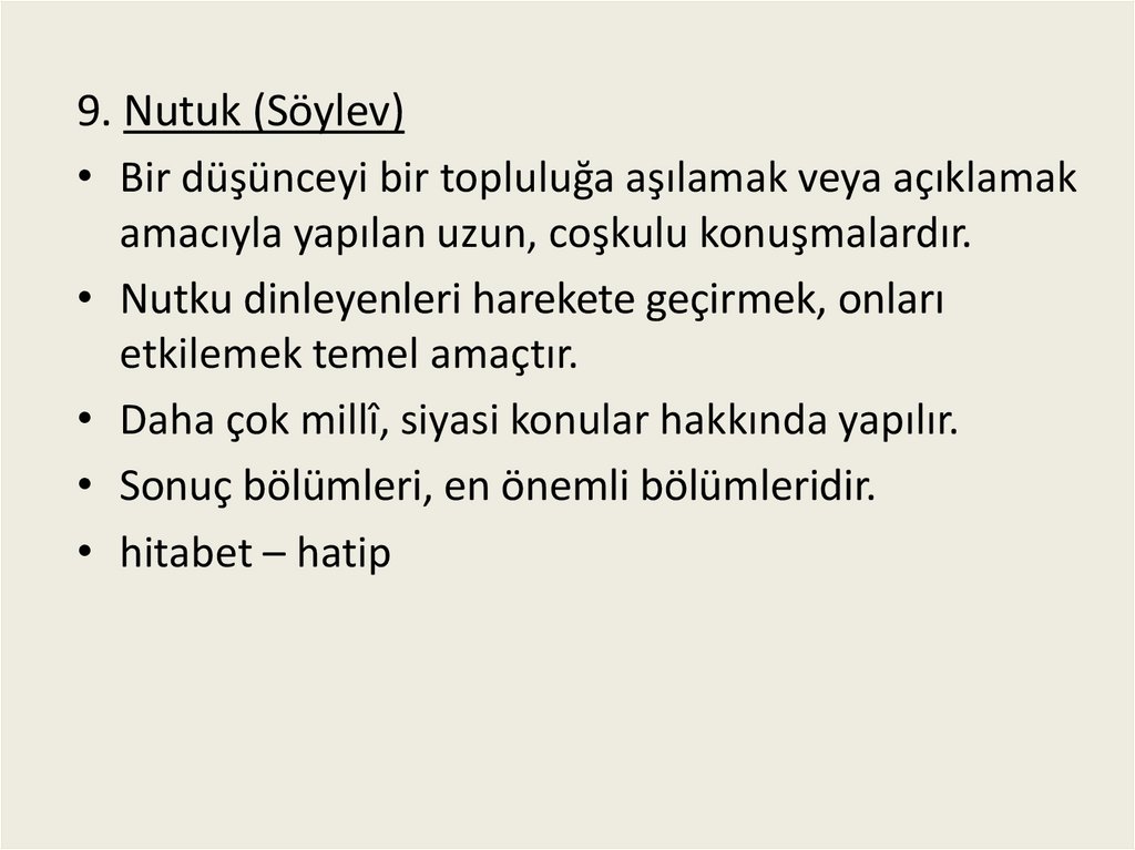9. Nutuk (Söylev)• Bir düşünceyi bir topluluğa aşılamak veya açıklamak